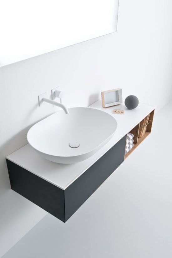 È sospeso, ha un capiente cassettone portaoggetti e il mobile include il portasciugamani (Azienda: Idea Group – linea Basic).